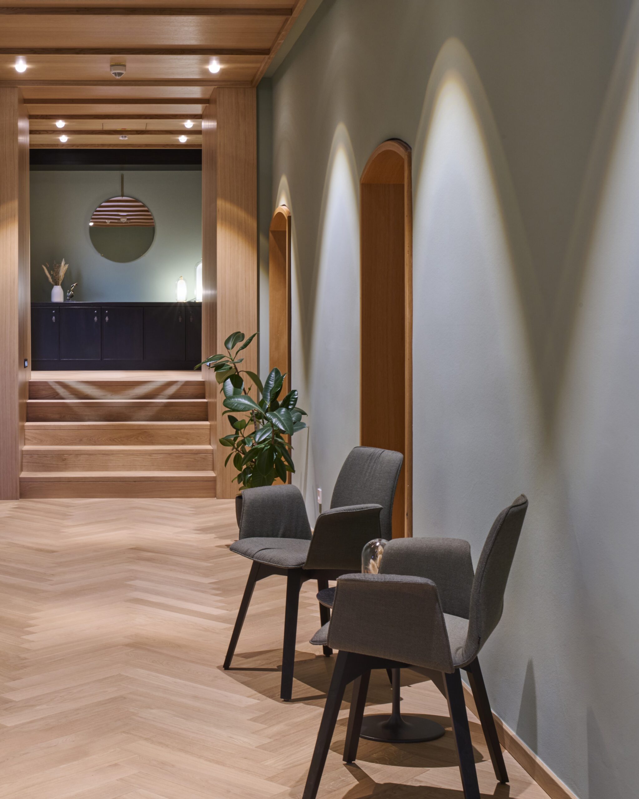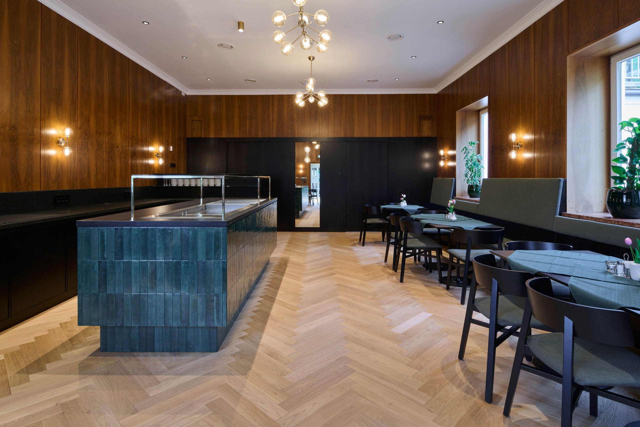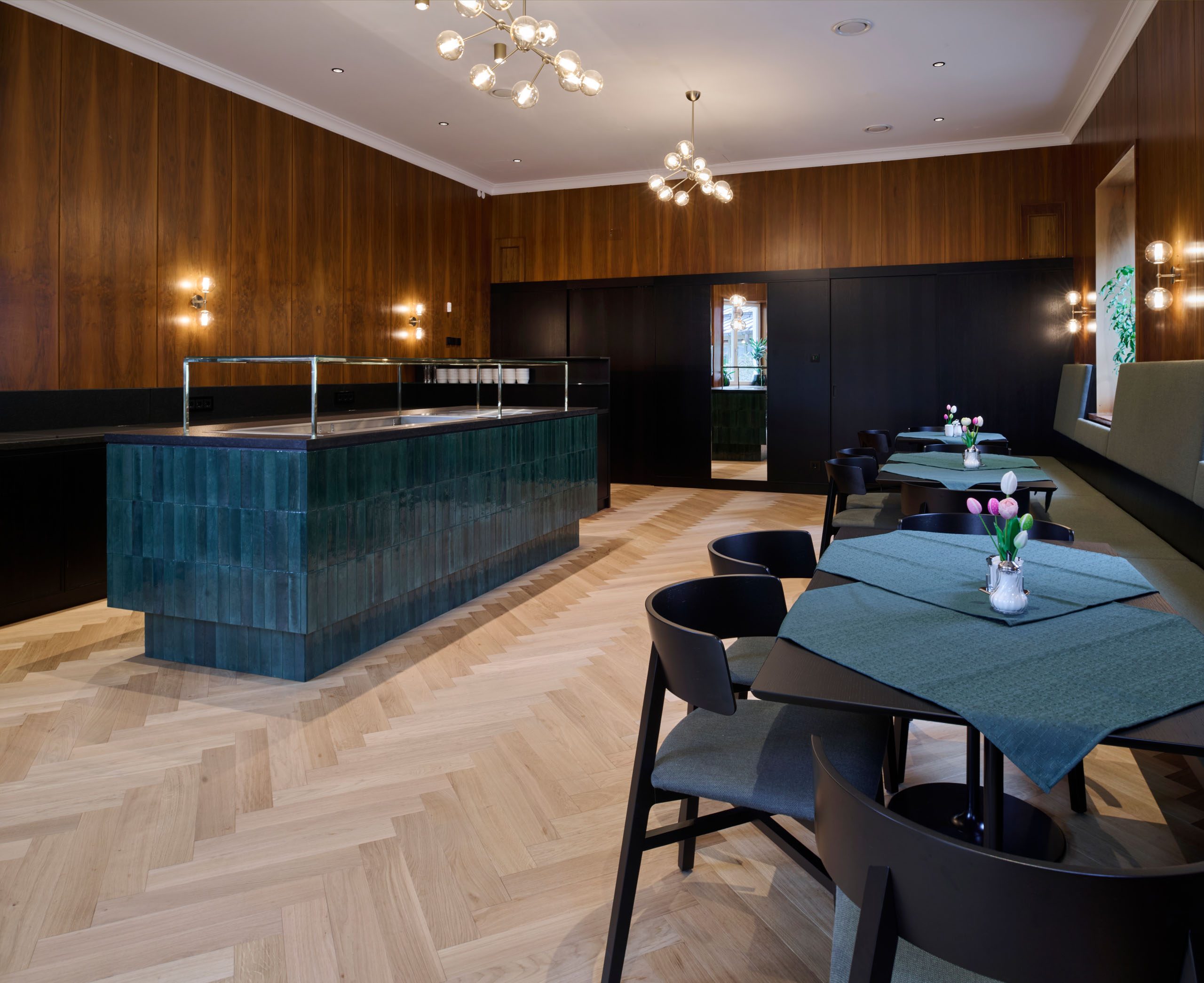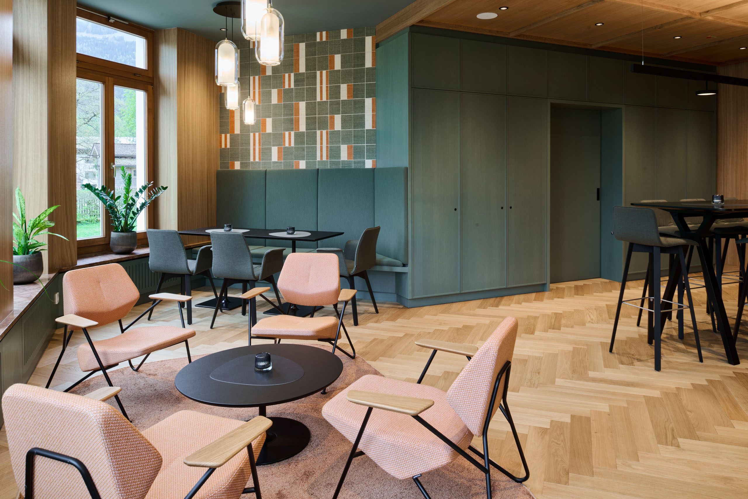 Tapete MERIDA PARTITURA von ELITIS // Tisch rund DIZZIE von ARPER; Design Lievore Altherr Molina // POLYGON Chair von PROSTORIA; Design Numen/ForUse // Tisch eckig DIZZIE von ARPER; Design Lievore Altherr Molina // Stuhl MAVERICK CASUAL von KFF; Hoffmann Kahleyss Design