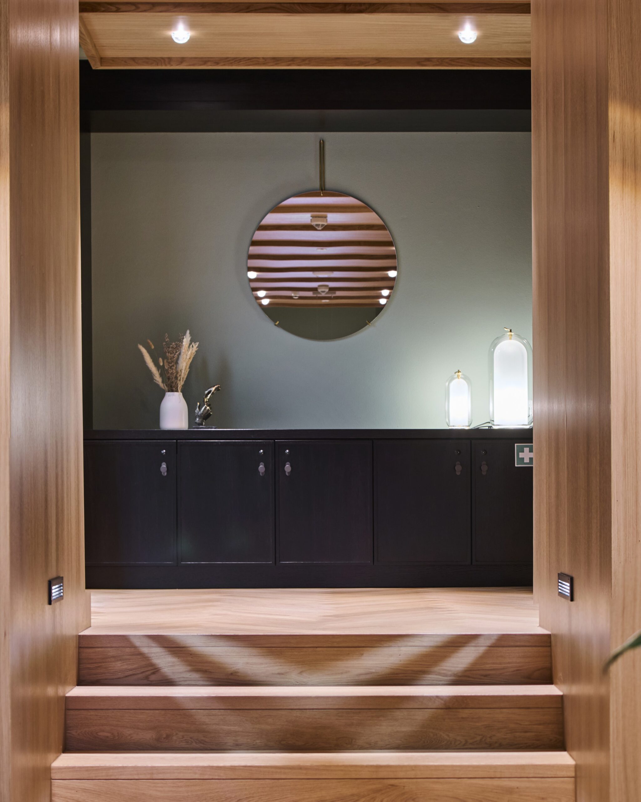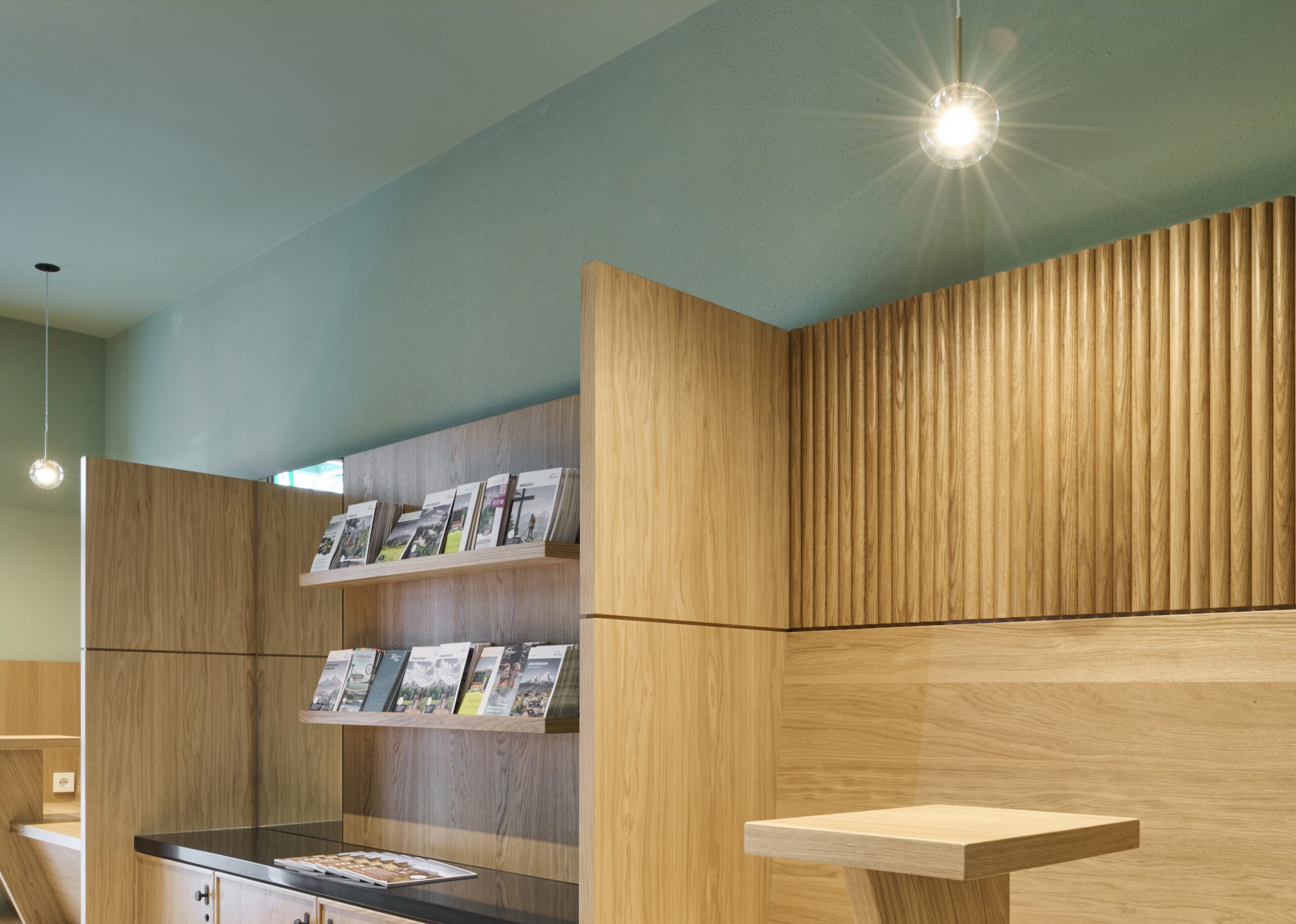 Tisch DIZZIE von ARPER; Design Lievore Altherr Molina // Stuhl MAVERICK CASUAL von KFF; Hoffmann Kahleyss Design // Einbauspot BOULY von TRIZO21; Design Bruno Van Meenen